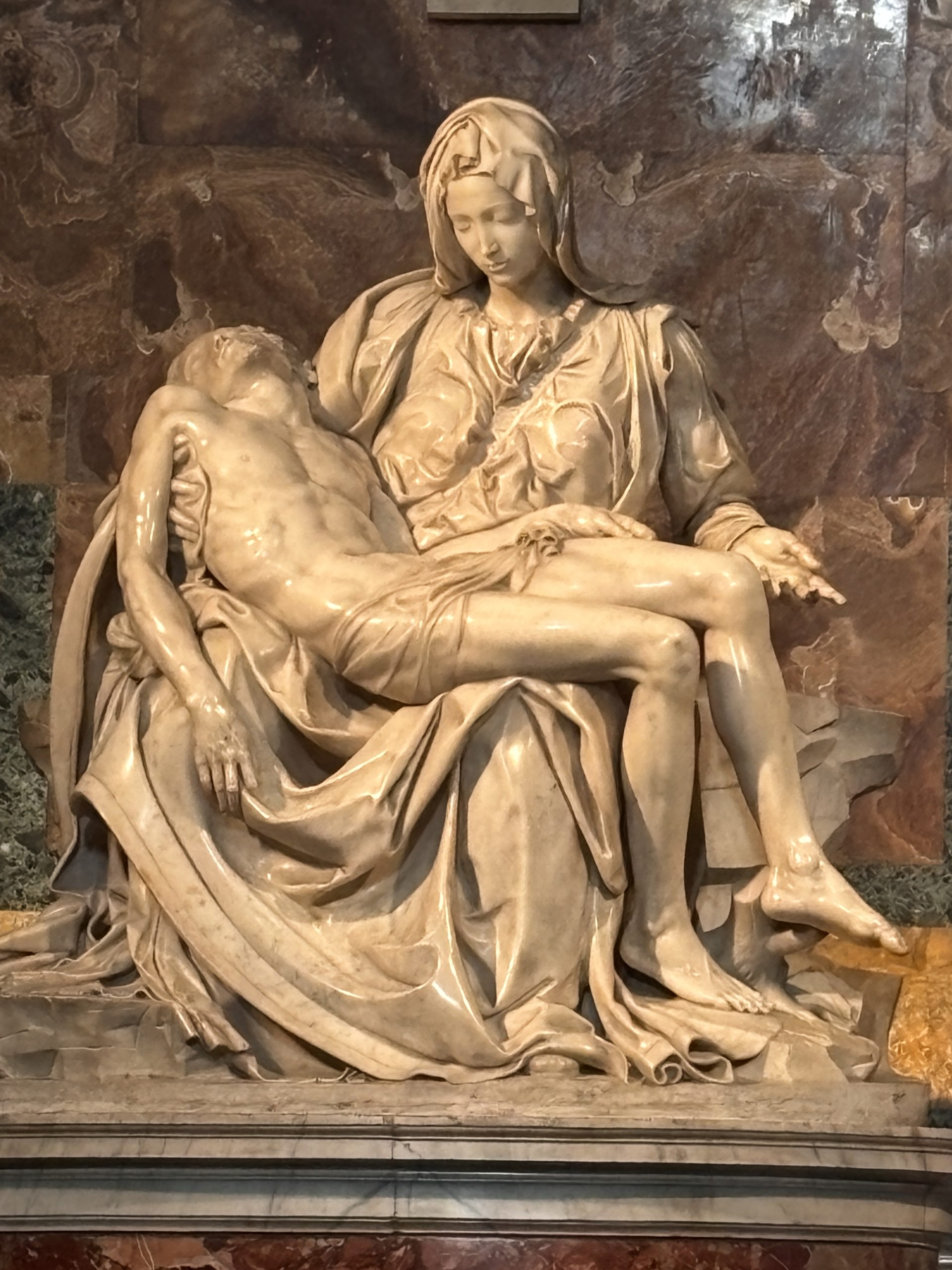 Great emotion is evoked on Mary's face as she holds her son. Michaelangelo intentionally worked spiritual truths into the sculpture for reflection. Mary's right hand cradles her son as she would have done many times, while her left hand is opened toward God in an offering posture. Mary's life was full of this tension, loving her son and simultaneously accepting he was the Son of God and was on earth to do the will of his Father.