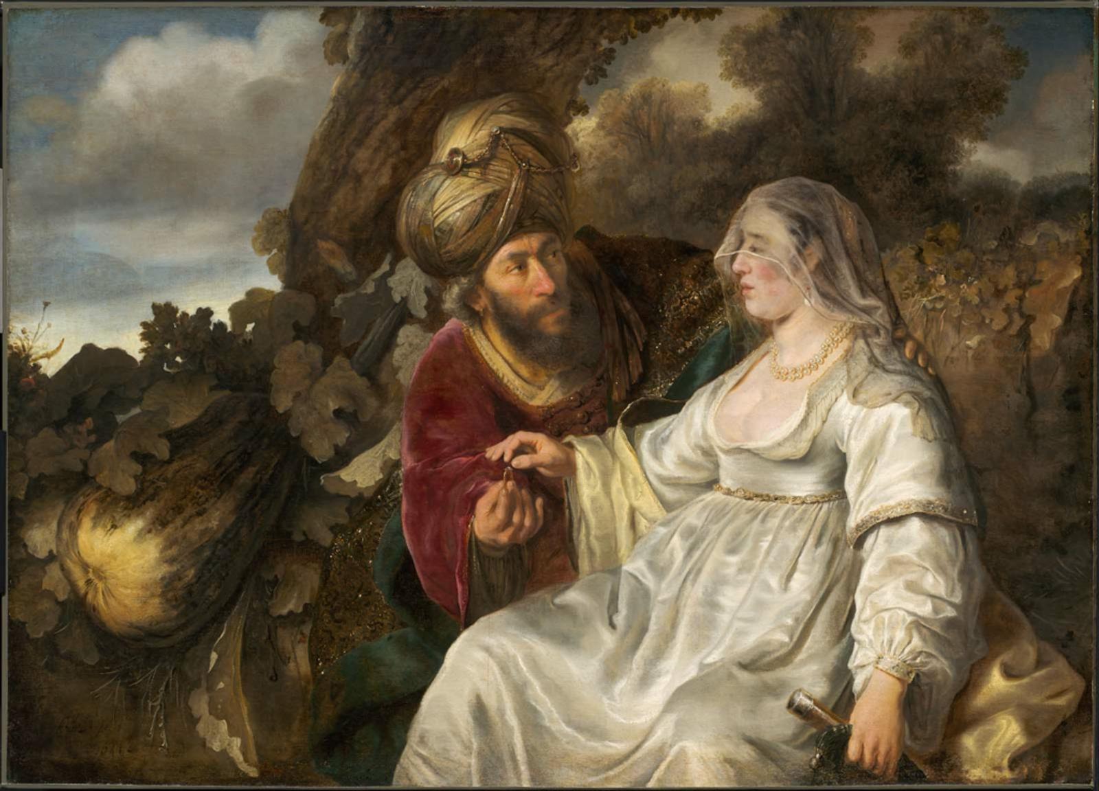 The artist, Ferdinand Bol, was a student of the master painter Rembrandt, and similarities in style are evident. Figures are painted in dramatic circumstances using intense colors and expressing deep emotion. Tamar is forefront and dressed in white, symbolizing her righteousness in the situation. While her countenance is bathed in light, Judah’s face is shadowed. Genesis 38: 16 describes Judah turning his head to Tamar and propositioning her, as he is seen here. She holds all three objects of the pledge she made with Judah that signified his identity until he could send her the agreed payment of a goat—his signet, his cord, and his staff. The seal of a person was proof of their identification, like a legal signature functions today. A staff represented a person’s authority. A large fruit is painted into the vegetation of the background, possibly foreshadowing the fruitful result of the birth of twins that resulted from this event.